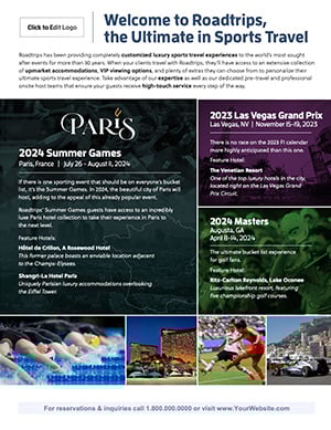 One of the first things many travel agencies realize when they start marketing travel to major sporting events is that many of their best clients are already seeking out sports travel experiences. To assist our travel advisor partners in promoting this niche market (and in turn creating value for their clients and big commissions for the company), we have created a one page flyer that can be branded with your agency and contact info. It provides a calendar of the top sporting events around the world and also serves as a handy cheat sheet for advisors to know when and where top events are located.